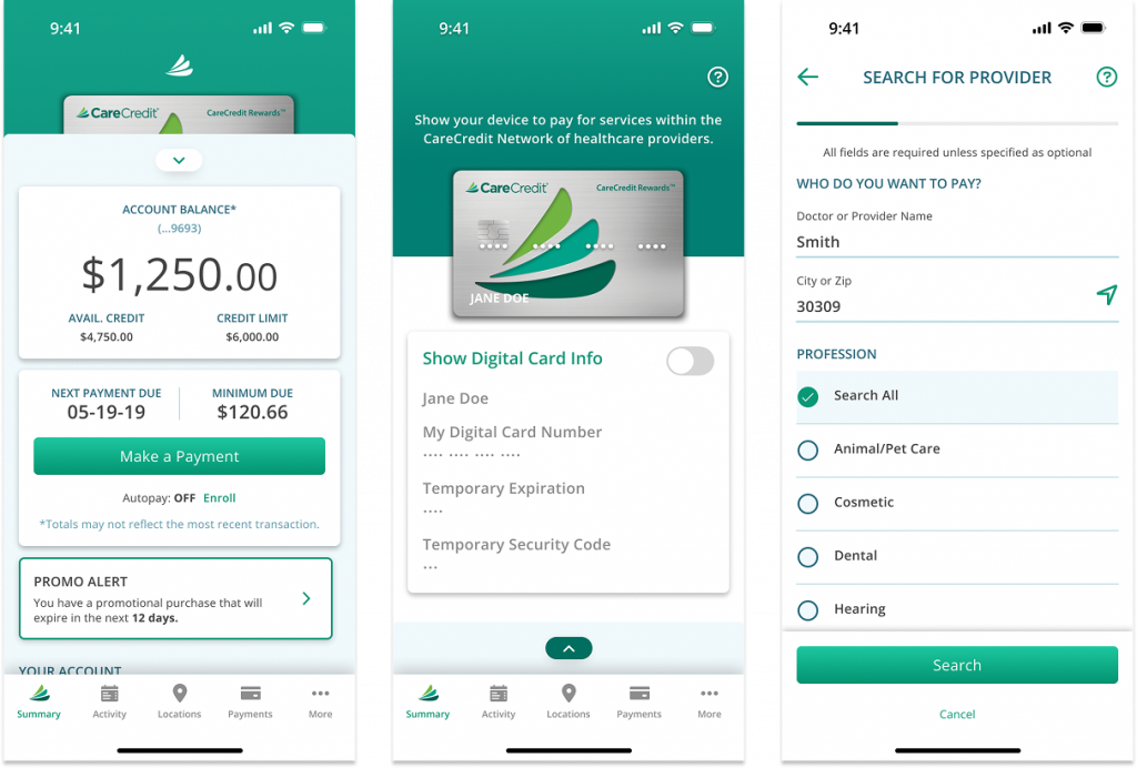 CareCredit is Synchrony’s healthcare credit card mobile app (iOS and Android) that enables users to manage their accounts, pay providers, and make payments.