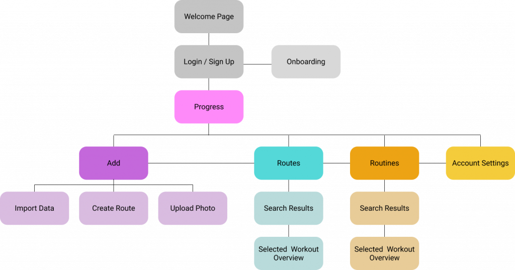 Card sorting revealed clear separation in landing pages for routes, routines, and the “add” drop down menu features. Account settings were also a clear grouping from the card sort, however, results displayed significant overlap with the other features. Those results informed my decision to include account settings as a drop down in the top navigation bar, making them accessible from all landing pages.